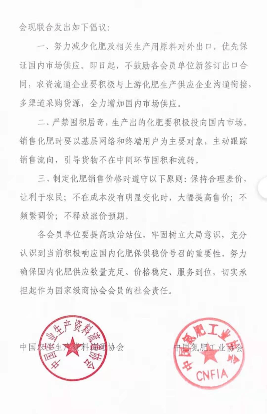 针对今年以来国内氮肥、磷肥、钾肥等主要化肥品种价格上涨形势,为推动国内化肥企业积极履行社会责任,保护农民种粮积极性,推动化肥行业持续健康发展,中国农资流通协会、中国氮肥工业协会、中国磷复肥工业协会、中国无机盐工业协会钾盐钾肥行业分会和中国五矿化工进出口商会现联合发出如下倡议: